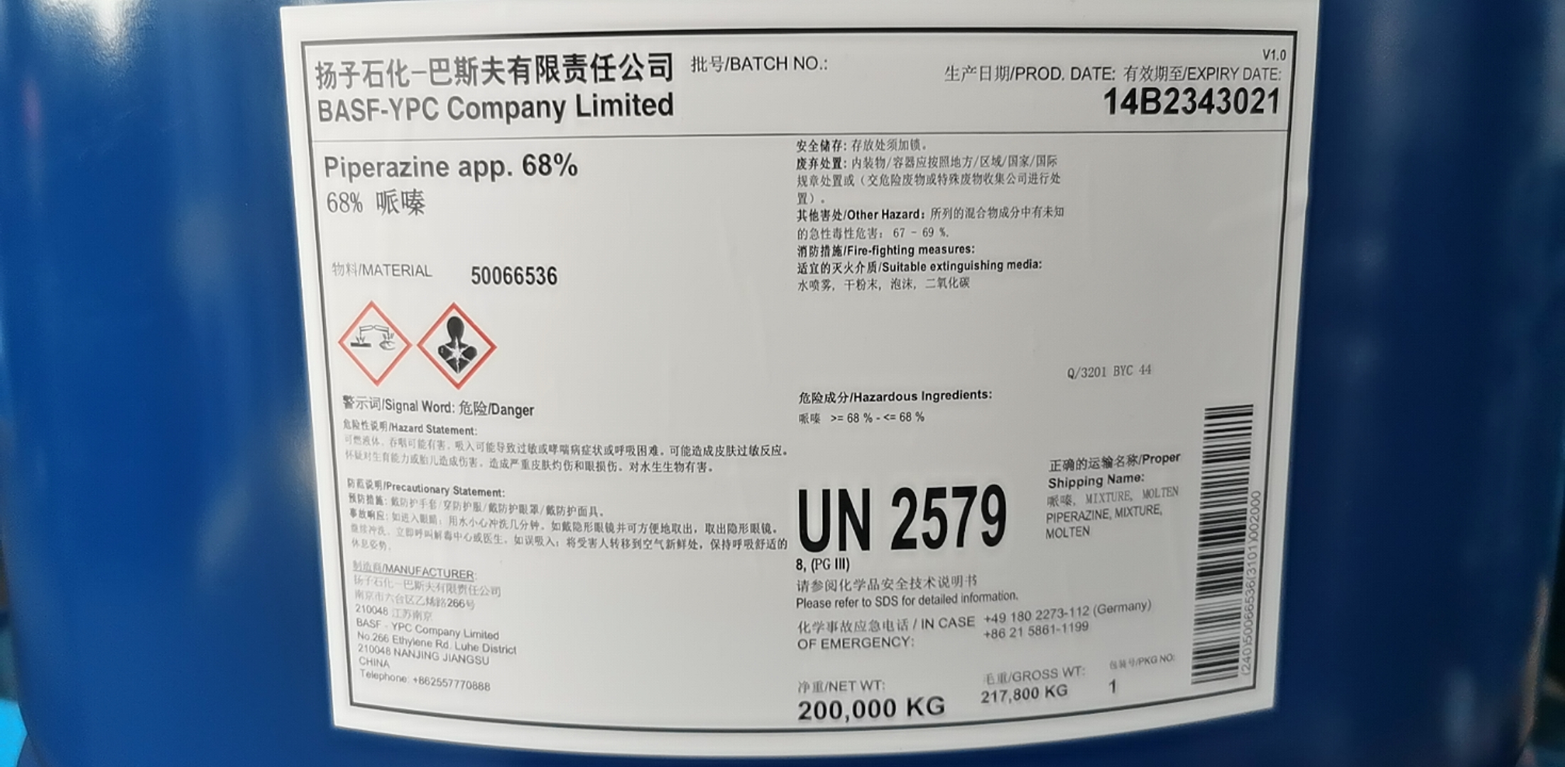 產(chǎn)品名 | 68%哌嗪 六八哌嗪、二乙基二胺 | 英文名 | 68%Piperazine | 產(chǎn)品外觀(guān) | 無(wú)色粘稠液體 | 包裝規(guī)格 | 200kg/桶(鐵桶) | 產(chǎn)地 | 南京 | 供應(yīng)商 | 揚(yáng)子巴斯夫 | 應(yīng)用 | 阻燃劑、螯合劑、醫(yī)藥中間體、農(nóng)藥中間體等。 | 危險(xiǎn)類(lèi)別 | 8類(lèi)危化品 | CAS NO | 110-85-0 |